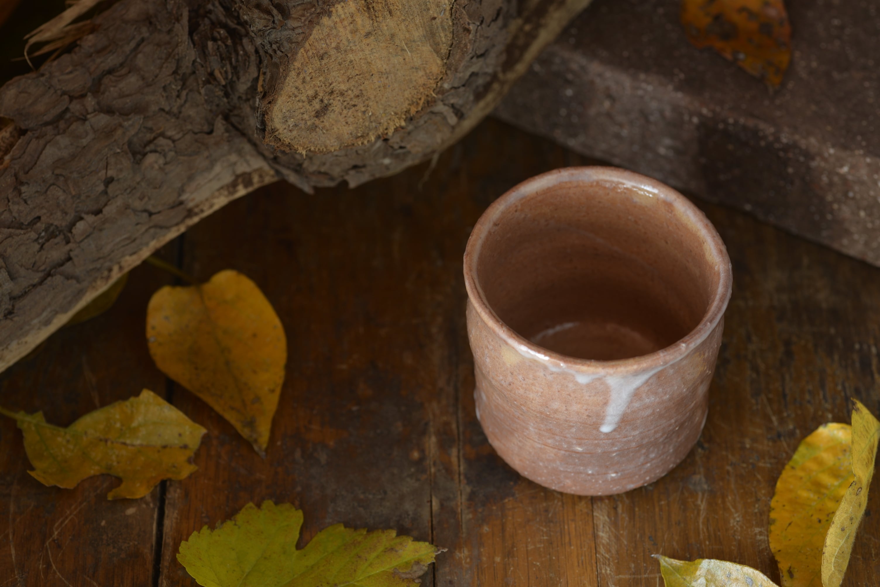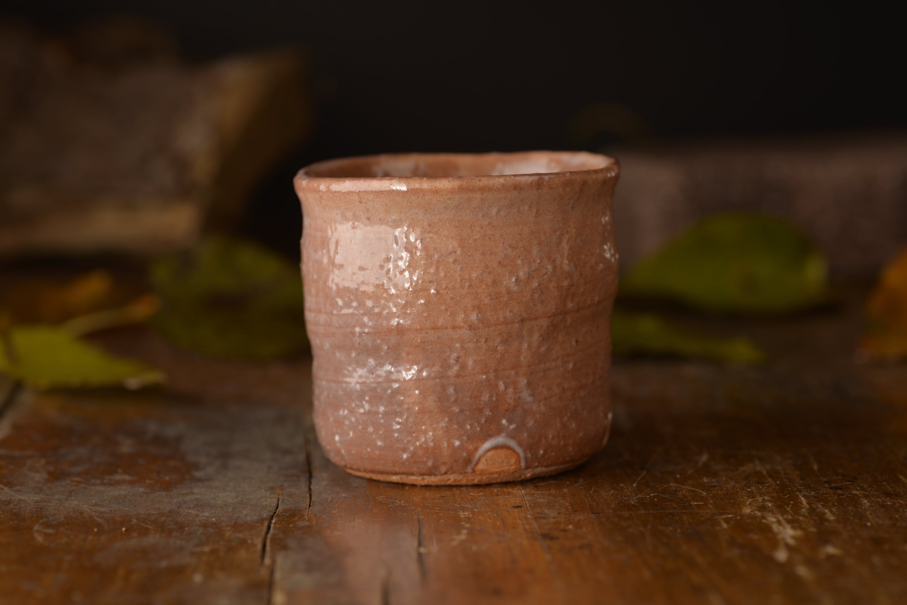 シンプルな焼酎カップです。よく焼けて、土の中の砂が表面に出てきています。また、強いロクロ目が全体に入っていて、独特の雰囲気を出しています。