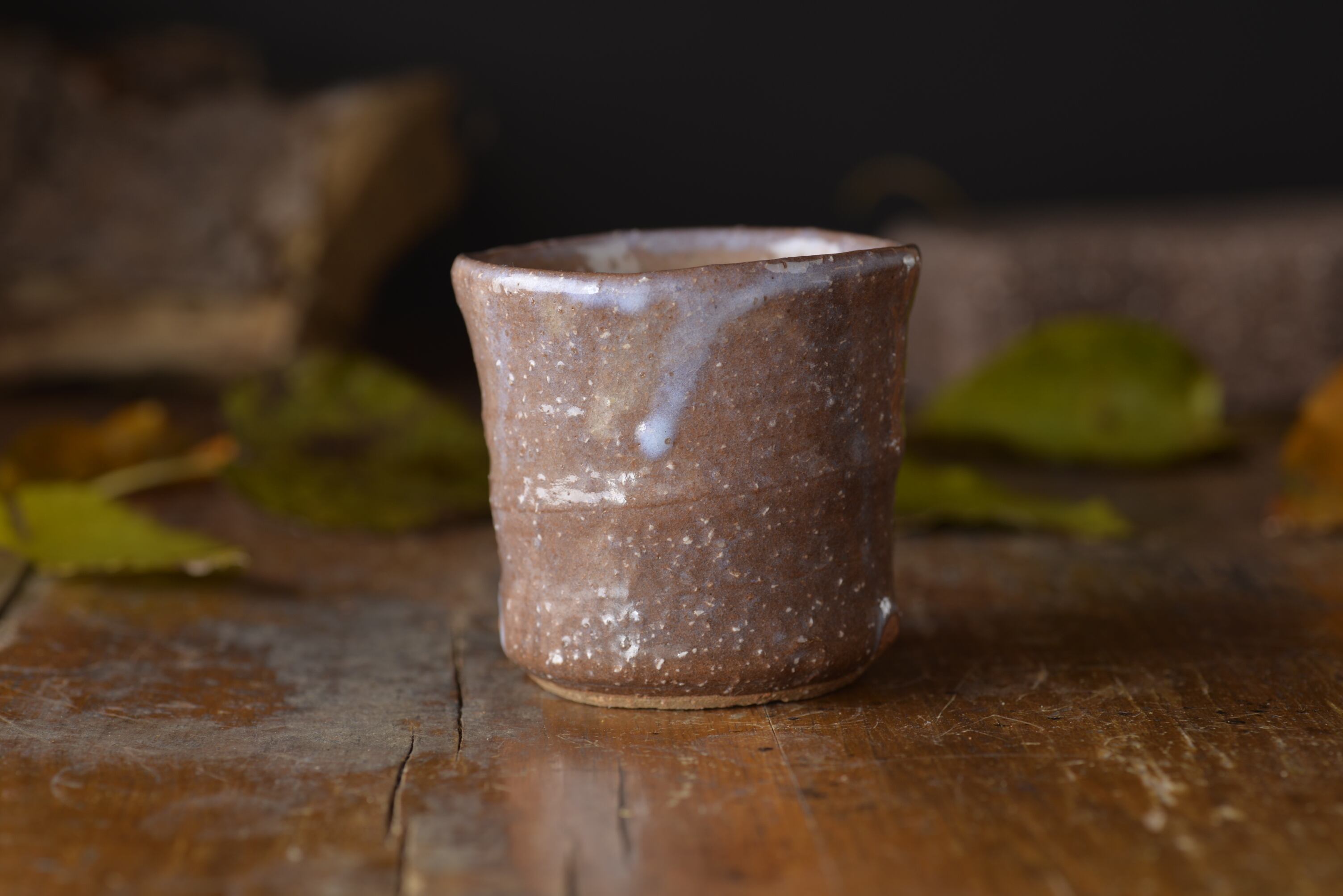 シンプルな焼酎カップです。よく焼けて、土の中の砂が表面に出てきています。また、強いロクロ目が全体に入っていて、独特の雰囲気を出しています。