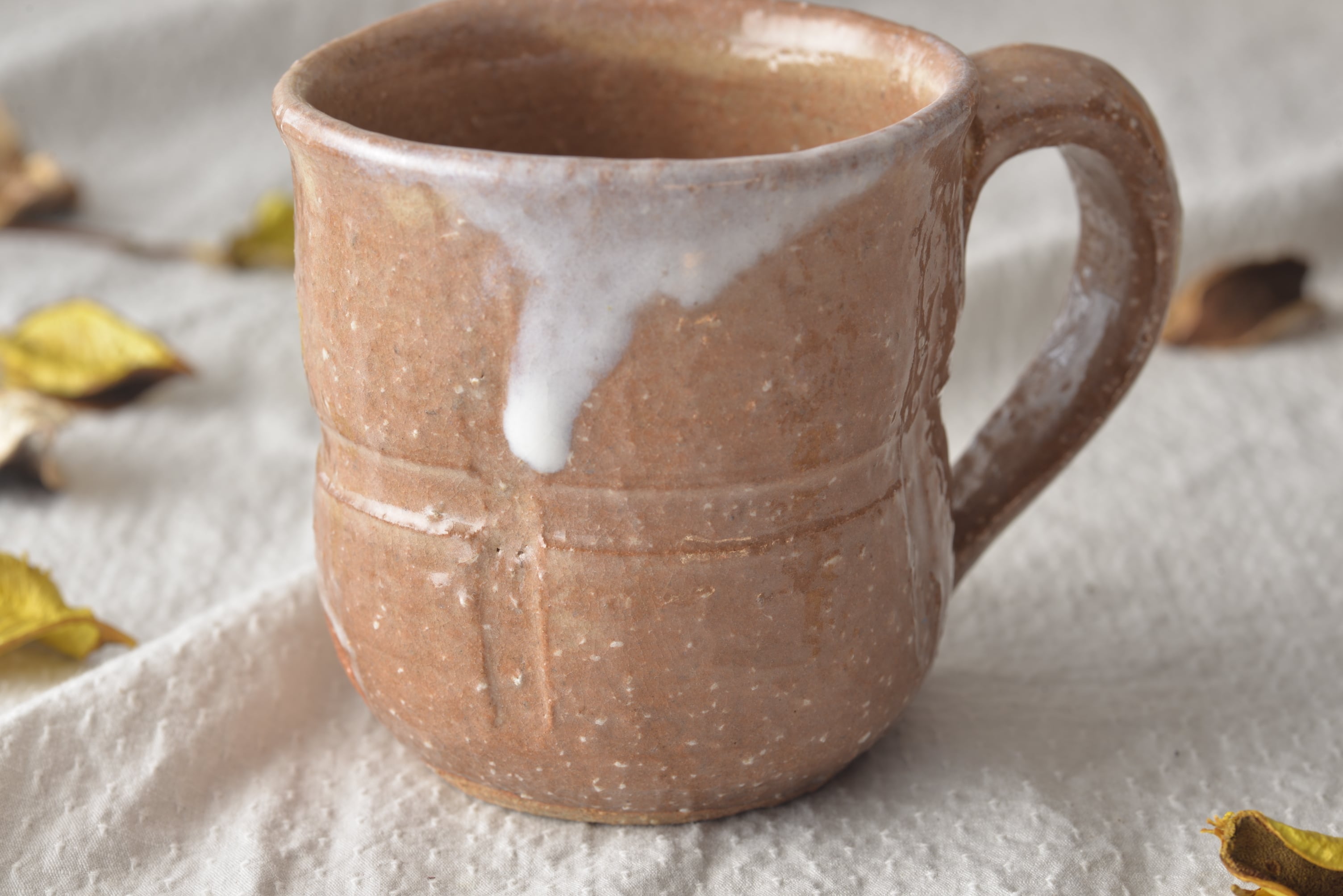 少し変わったデザインのマグカップです。ろくろで成形したあと、胴にぐるりとヘラ目を入れ、さらに四方に縦にヘラ目を入れています。