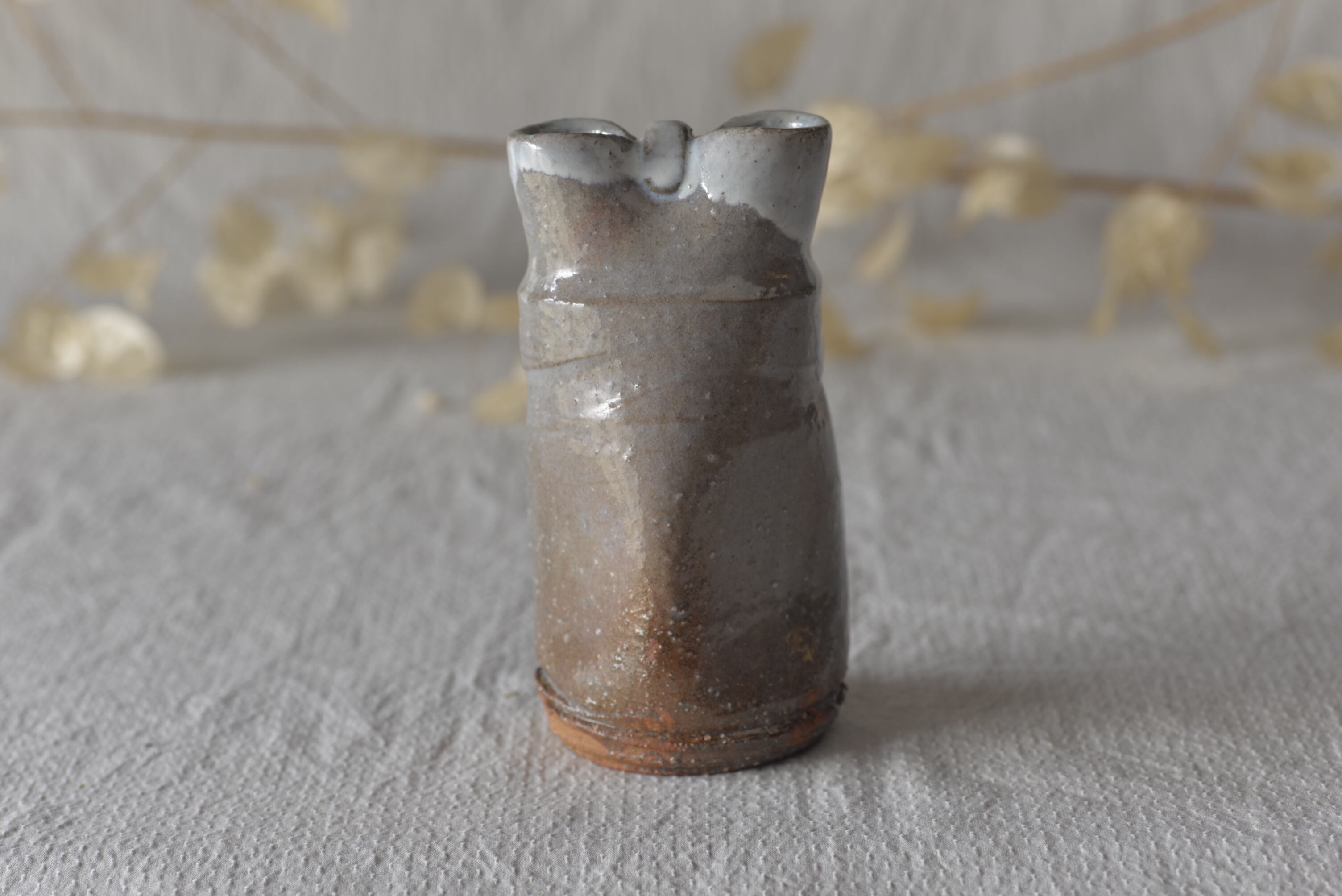 口辺をつまんで、二つの口にした花入です。
