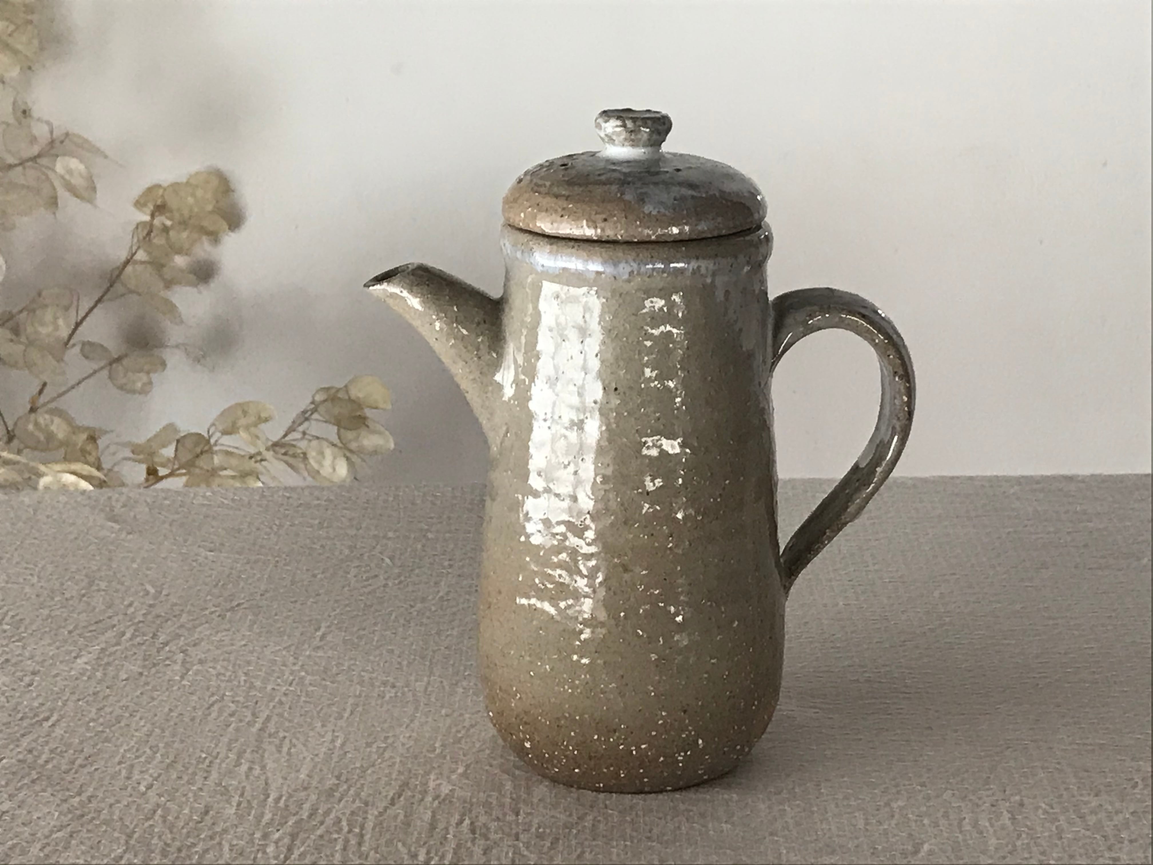 ポット上部の藁灰釉を掛けた部分に、紫色に変色する「窯変」が出ています。登り窯ならではの現象です。