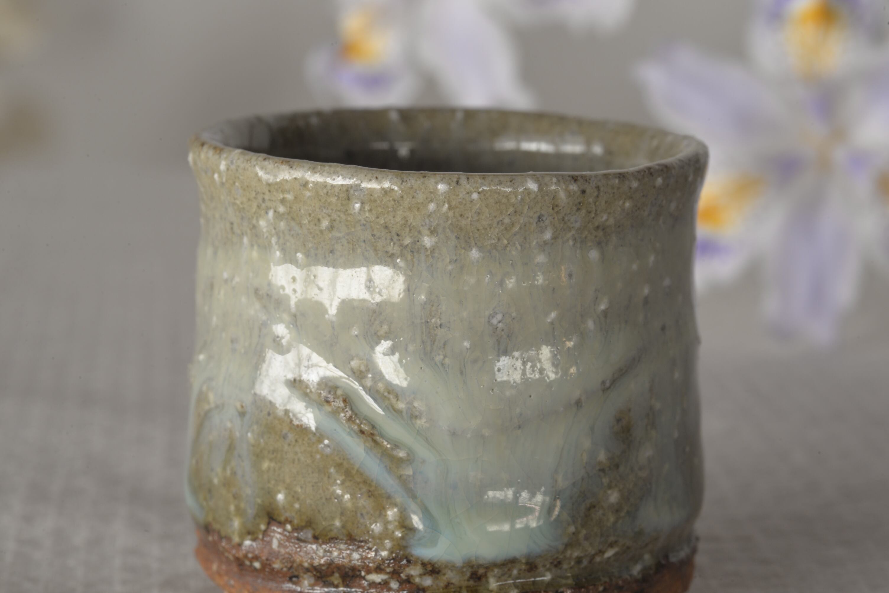 全体に掛けた藁灰釉に、土に含まれる鉄分が溶けだした部分がきれいな緑~青色に発色しています。全体に波様の櫛(くし)目を入れたぐい呑です。