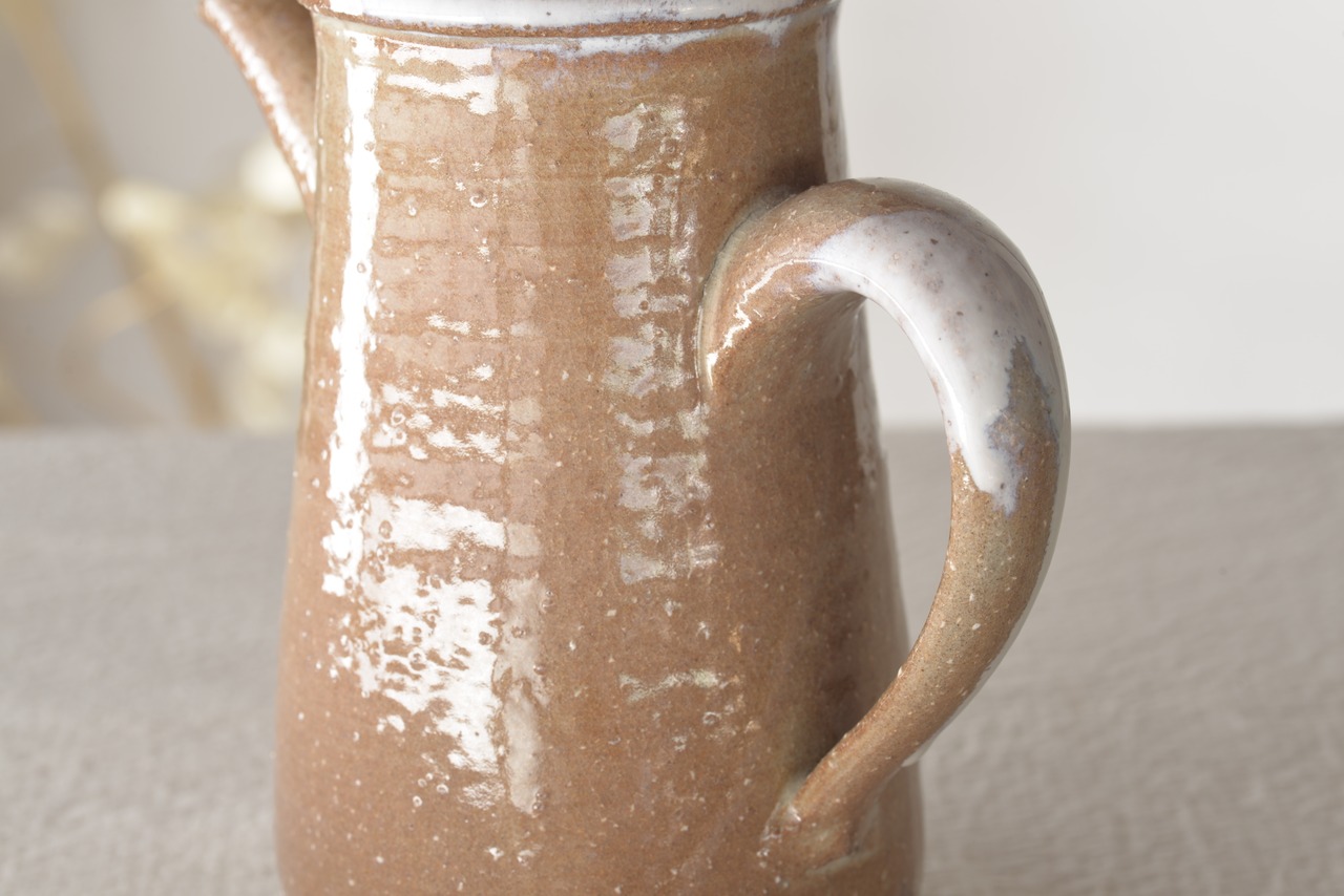 上部の藁灰釉を掛けた部分に「窯変」が出ています。窯変というのは、窯焚きの際に藁灰釉と薪が化学反応を起こし、普通なら白くなるところが紫色になるものです。登り窯に特有の現象とも言われ、これを珍重する人もいます。